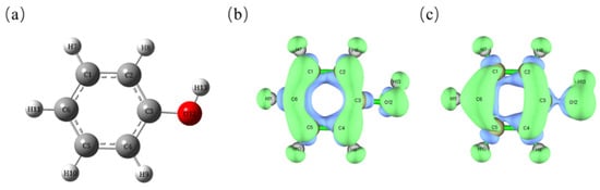 (a) shows the phenol molecule model, (b) shows the isosurface map of f0, and (c) shows the isosurface map of f−.