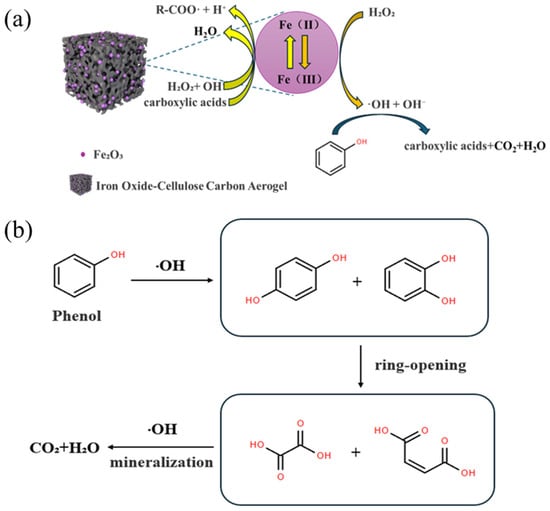 Herein, we fabricated an iron oxide-loaded nanocellulose-based carbon aerogel through a one-pot sol–gel method [12]. Cellulose, serving as a stable carbon-rich precursor, offers the advantages of abundance and wide availability [13]. The derived nanocellulose–carbon aerogel exhibits excellent stability, an electron-rich structure, and superior porous characteristics [14]. During synthesis, iron ion salts, ammonia solution, and crosslinking agents were fully dispersed into the cellulose solution [15]. Following thorough mixing and dispersion at room temperature, hydrogel formation was achieved [16], and subsequent freeze-drying and vacuum carbonization yielded the iron oxide-incorporated cellulose-based carbon aerogel [17]. To further broaden the Fenton reaction’s pH applicability, copper and cerium ions were introduced to synthesize a polymetal oxide/cellulose-based carbon aerogel [18]. Meanwhile, the material’s catalytic degradation efficiency, recyclability, and phenol degradation mechanisms were systematically investigated [19].