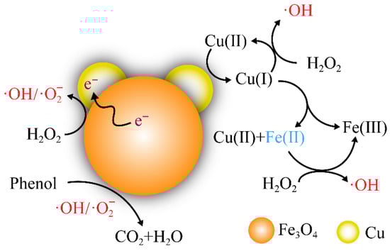 As shown in Figure 13, the addition of the transition metal Cu promotes the cycling of Fe3+/Fe2+, accelerates the charge transfer process, and promotes the generation of ∙OH. At the same time, Cu+/Cu2+ can directly react with H2O2 to produce ∙OH [76], thereby enhancing the degradation efficiency of phenol. The introduction of Ce can cause an increase in Cu(I) and unpaired electrons, which is beneficial for electron transfer and the regeneration of active sites. Moreover, Ce3+/Ce4+ can also, theoretically, catalyze the decomposition of H2O2 to generate ∙OH.