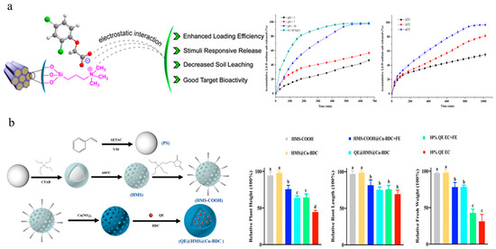 Silica-based nanoherbicides: (a) Preparation and controlled release of 2,4-D sodium salt@MSN-trimethylammonium nanoparticles [67]. Copyright, 2018 American Chemical Society; (b) Preparation and safety experiments of quizalofop-p-ethyl@HMS@Cu-BDC and rice safety [69]. Copyright, 2023 John Wiley & Sons Ltd.