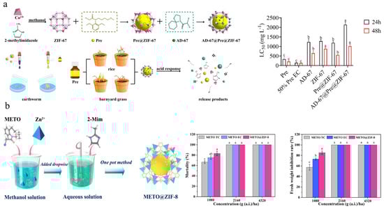 MOFs-based nanoherbicides: (a) Preparation of AD-67@Pretilachlor@ZIF-67 and safety of earthworms [77]. Copyright, 2023 Royal Society of Chemistry; (b) Metolachlor@ZIF-8 preparation and herbicidal activity [74]. Copyright, 2022 John Wiley & Sons Ltd.