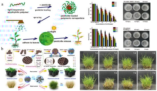 Stimuli-responsive nanoherbicides: (a) The release mechanism of 2,4-D nanoparticles and their biosafety on zebrafish [127]. Copyright, 2022 American Chemical Society; (b) Preparation and herbicidal effect of pH-responsive nanoherbicide system co-loading avermectin and prometrinet [66]. Copyright, 2024 John Wiley & Sons Ltd.