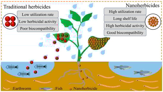In recent years, the emergence of nanotechnology has introduced new opportunities for sustainable agricultural practices, offering significant potential to facilitate the transformation from traditional farming methods to precision and smart agriculture [8]. The interdisciplinary convergence of nanomaterials and nanotechnologies with pesticide formulation science has spurred the robust advancement of nanopesticides. In 2019, nanopesticides were recognized as the top emerging technology in the field of chemistry by the International Union of Pure and Applied Chemistry. The term “nanopesticides” encompasses pesticide formulations that either intentionally incorporate entities within the nanometer scale (typically less than 500 nm, as regulated by the European Union and the US Environmental Protection Agency), or is purported to exhibit novel properties attributable to their small size [9,10]. A comprehensive statistical analysis reveals that when compared with non-nanoscale analogs, nanopesticides exhibit a 31.5% enhancement in overall efficacy against target organisms, including an 18.9% increased efficacy in field trials. Additionally, the premature loss of active ingredients prior to reaching target organisms is diminished by 41.4%, paired with a 22.1% lower leaching potential in soil. Particularly, the toxicity of nanopesticides to non-target organisms is reduced by 43.1% [10]. Although the advantages of nanopesticides have been extensively demonstrated, current research and development efforts are predominantly focused on insecticides and fungicides [11,12], with relatively few reports on nanoherbicides. On the one hand, since certain typical herbicides, such as paraquat, glufosinate ammonium, and glyphosate are water-soluble and exist in a molecular state in water, they do not require nano-processing from the perspective of dispersion. On the other hand, due to differences among insecticides, fungicides, and herbicides in terms of target organisms, application methods, and pricing, greater attention has been directed toward nanoinsecticides and nanofungicides.