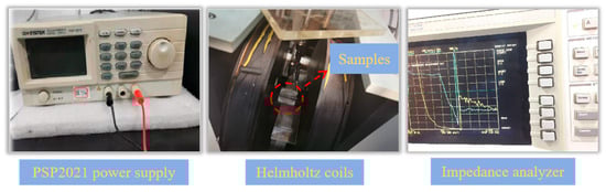 where Z(Hex) and Z(Hmax) were the impedance values of the samples in the external field and the maximum magnetic field, and Z(Hmax)is 90 Oe. The instrument shown in Figure 2 is the giant magneto-impedance effect testing system used in this experiment.