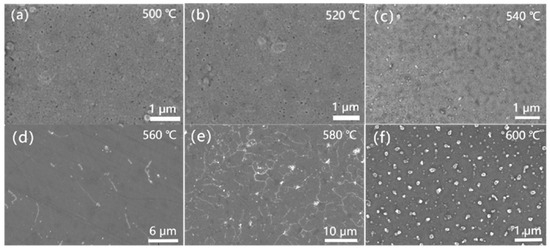 SEM images of FINEMET/G composite ribbons at (a) 500 °C, (b) 520 °C, (c) 540 °C, (d) 560 °C, (e) 580 °C, and (f) 600 °C.