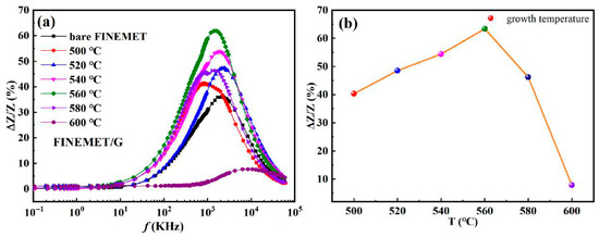 Figure 4b depicts the relationship between the maximum GMI ratio at the characteristic frequency and growth temperature. It is notable from the line chart in Figure 4b that the maximum GMI ratio initially increased with the growth temperature until 560 °C and decreased in the end. Obviously, the maximum impedance ratio reached the maximum (61.9%) at 560 °C. In the range of 500 °C to 560 °C, the graphene layer could achieve better quality in the skin layer. As the temperature increased, the surface morphology of the FINEMET/G became flatter and smoother and had better uniformity. As mentioned earlier, the FINEMET/G had the best crystalline state at 560 °C, where the soft magnetic properties could be kept in extremely good condition. In this case, the conductivity and electron mobility of the composite ribbon became better, forcing the current to concentrate on the surface, which made the resistance of the skin layer come down. As a result, the current was more concentrated on the FINEMET/G surface so that the enhanced skin effect led to the enhancement of GMI. However, the maximum impedance ratio fell quickly after 560 °C. As mentioned above, the crystallization coefficient, related closely to the micro-structure, was greatly affected by the growth temperature. When the ambient temperature was higher than 560 °C, the Fe-B phase under the graphene layer went through a relaxation and crystallization process, resulting in a decrease in the maximum impedance ratio, and it made the soft magnetic properties worse as the temperature increased. In conclusion, the results shown in Figure 4a,b indicate that 560 °C was the optimal value for the best GMI effect, which is the same as what we see in Figure 3.