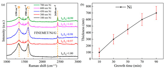 By adjusting the magnetron sputtering time, we designed some specimens with different Ni layer thicknesses. The thickness of Ni layers was measured by a step profiler, and the quality and layer number of the graphene were evaluated by Raman spectroscopy [39,40]. Figure 6a shows the Raman spectrum of the FINEMET/Ni/G composite ribbons with different Ni layer thicknesses. The relationship between the Ni layer thickness and growth time is exhibited in Figure 6b. The appearance of a graphene characteristic peak indicates that the graphene layer was synthesized successfully. The D and G characteristic peak of the graphene layer was at 1350 cm−1 and 1580 cm−1, and that of the FINEMET ribbon was at 2430 cm−1. There were in total five different color curves corresponding to different thicknesses of Ni layers. As shown in Figure 6a, the intensity ratios of the D and G peak (ID/IG) were generally high, indicating that the quality of the graphene was not high. This is because the higher the ID/IG was, the more defects the graphene had. Hence, the ID/IG of the FINEMET/Ni/G (corresponding to the red curve in this figure) was found to have the lowest value of 0.97 when the thickness of the Ni layer was 300 nm and the temperature was set to 560 °C. Under these conditions, the quality of the graphene layer was optimum, and with this comes the largest impedance ratio. This is mainly because functional group residues and structural defects cannot be completely removed on the graphene layer, resulting in a high ID/IG ratio of graphene [41,42].