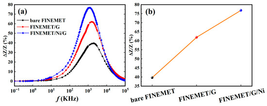 According to the previous data analysis, the GMI performance of FINEMET/Ni/G with Ni layers was better than that of FINEMET/G without Ni layers, which could be explained by the following two aspects: Firstly, Ni, as a transition layer, improved the unevenness of the surface of the FINEMET ribbons, making the substrate flatter, which was helpful for improving the quality of the graphene layer synthesized by CVD. High-quality graphene has better conductivity, so it amplified the function of graphene as a conductive layer and increased the surface current density of the FINEMET/Ni/G, which caused a greater skin effect. Furthermore, the Ni layer was a material with good magnetic permeability, so the dynamic transverse permeability of the ribbons increased, and the skin depth decreased with the addition of the Ni layer, which led to an increase in impedance (Z).
