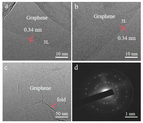 To investigate the quality of as-grown carbon films on FINEMET/Ni/G, the TEM was used to test the layer numbers of the graphene. As shown in Figure 9a–c, the thickness of graphene film was from 1–3 nm, which represents a layer number from 2–6. The specific number of layers of graphene can be seen from the SAED diagram in Figure 9d. Furthermore, the crystalline of the graphene was also obtained as layered configurations.