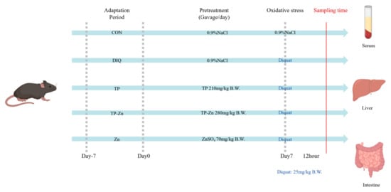 Thirty C57BL/6 male mice, 6 weeks old, were purchased from Slac Laboratory Animal Co., Ltd. (Shanghai, China). In this study, we used only male C57BL/6 mice to simplify the experimental design and minimize the potential impact of gender differences on experimental results. As shown in Figure 1, the mice were randomly divided into 5 groups (n = 6 per group): control group, DIQ group, TP group, Zn group, and Tp-Zn group. On day 0, by oral gavage, control group and DIQ group were given 0.9% NaCl, and the latter three groups were given 210 mg/kg of TP, 280 mg/kg of Tp-Zn, and 70 mg/kg of Zn (added as zinc sulfate), respectively, at 9:00 a.m. for seven days (Days 0–7). On Day 7, the mice in the control group were administrated saline by intraperitoneal injection; meanwhile, other groups were injected 25 mg/kg B.W. diquat (Shanghai, China). The dose of diquat was selected based on previous studies [,,]. After the diquat treatments for 12 h, the experimental mice were anesthetized with Halothane, and blood was quickly collected by extracting the eyeballs. During the experiment, the mice were fed with a basal diet and kept in 12 h light/dark cycle at 20–26 °C. The serum samples were separated by centrifugation at 3000 rpm for 10 min at 4 °C. Meanwhile, the abdominal cavity was opened, and tissues were quickly collected, frozen in liquid nitrogen, and stored at −80 °C. The dose of TP was selected based on a previous study []. We optimized the combined dose to maximize its synergistic antioxidant effects. All animal studies were conducted in accordance with the guidelines of the Animal Ethics Committee of Zhejiang University (ZJU20240808). As stipulated by the animal welfare protocol, all efforts were made to minimize animal suffering and to use the minimum number of animals necessary to produce reliable scientific data.