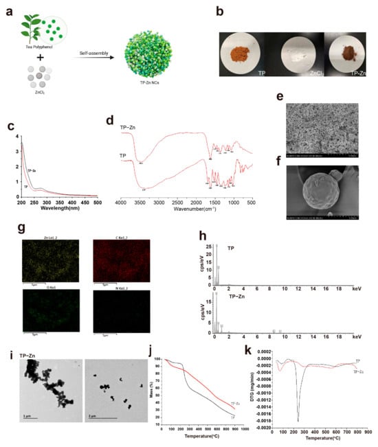Synthesis and characterization of Tp–Zn. (a) Synthesis of Tp-Zn. (b) Comparison of TP, ZnCl2, and Tp–Zn. (c) UV–vis spectra of TP and Tp–Zn. (d) FT–IR spectra of TP and Tp–Zn. (e,f) SEM images; scale bar = 5 μm. (g,h) EDS of TP and Tp–Zn. (i) TEM images; scale bar = 1–2 μm. (j,k) TGA of TP and Tp–Zn.