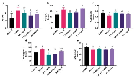 Our results revealed that compared with the control group, diquat treatment significantly increased the serum levels of AKP, TNF-α, and AST/ALT and decreased the levels of SOD and T-AOC. Compared with the DIQ group, Tp-Zn significantly reduced the serum levels of AKP, AST/ALT, and TNF-α, and the T-AOC level was significantly increased. The abnormal increase in AST/ALT ratio and AKP values are usually considered that liver cells have been seriously damaged []. TNF-α is a cytokine produced by immune cells that promotes inflammation [,]. These results indicated that diquat reduced the serum antioxidant level and increased the content of inflammatory factors in the serum of mice, while Tp-Zn significantly increased serum antioxidant levels and reduced liver damage in mice.