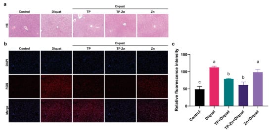 As shown in Figure 4a, compared to the control group, liver cells of mice in the DIQ group showed obvious shrinkage and vacuoles existed, indicating that diquat caused substantial damage to the liver of mice. A few vacuoles were also present in the TP and Zn groups, but no obvious lesions were observed in the liver sections of the Tp-Zn group compared to the DIQ group, thus indicating that Tp-Zn could alleviate liver damage in mice caused by diquat. Compared with the control group, diquat significantly increased the level of ROS, which corresponds to the results of H&E staining of liver. Compared with the DIQ group, Tp-Zn, TP, and zinc treatment alleviated the damage caused by diquat and reduced the ROS content in the liver (Figure 4b,c); the Tp-Zn group showed the best protection against liver damage in mice.