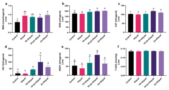 Effect of Tp-Zn on the antioxidant ability of the liver in diquat-induced mice (n = 6). (a–f) Levels of MDA, SOD, CAT, HO-1, NQO1, and T-AOC in the liver of different groups of mice. abcd: Means without a common letter differ significantly (p < 0.05). Error bars denote SD.