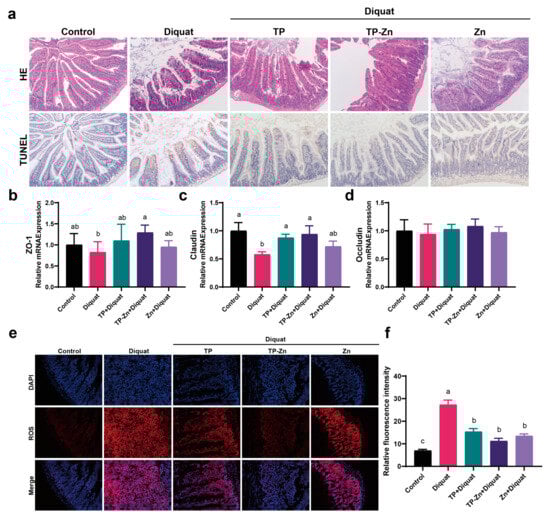 The intestinal revealed that DIQ significantly disrupted the structure of intestinal villi, while the other three treatments showed varying degrees of improvement (Figure 6a). TUNEL showed that the intestinal villi apical epithelial cells in the DIQ group were seriously apoptotic (Figure 6a). Compared to the DIQ group, treatment of TP and Tp-Zn alleviated the apoptosis of intestinal epithelial cells and the destruction of intestinal villi structure, but the degree of apoptosis was still higher than that in the control group. The mRNA expression of tight junction proteins in mice intestine were measured to further evaluate the integrity of the intestinal barrier (Figure 6b–d). Compared with the control group, diquat significantly down-regulated the mRNA expression of tight junction proteins ZO-1 and Claudin (p < 0.05), while Tp-Zn effectively alleviated the decrease in mRNA expression of these two proteins, with a better effect than TP and Zn. Tp-Zn, TP, and Zn treatment alleviated intestinal damage caused by diquat and reduced the ROS content in the small intestine compared with the DIQ group (Figure 6e,f). The results showed that pre-treatment with Tp-Zn effectively alleviated the oxidative stress injury of small intestine induced by diquat, and the effect was more effective than that of TP group and Zn group.