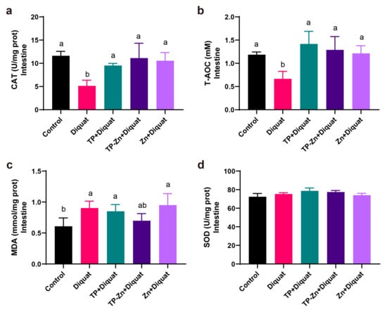 Effect of Tp-Zn on the antioxidant ability of the intestine in diquat-induced mice (n = 6). (a–d) Levels of CAT, T-AOC, MDA, SOD in the intestine of different groups of mice. ab: Means without a common letter differ significantly (p < 0.05). Error bars denote SD.