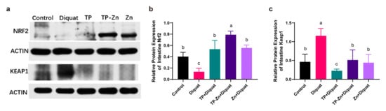 As shown in Figure 7a–d, compared with the control group, the levels of CAT and T-AOC in the intestine of the DIQ group were significantly decreased (p < 0.05), and the level of MDA increased (p < 0.05). Compared with the DIQ group, the levels of CAT and T-AOC in the TP group and Tp-Zn group were significantly increased (p < 0.05), while the value of the Tp-Zn group was closer to the control group.