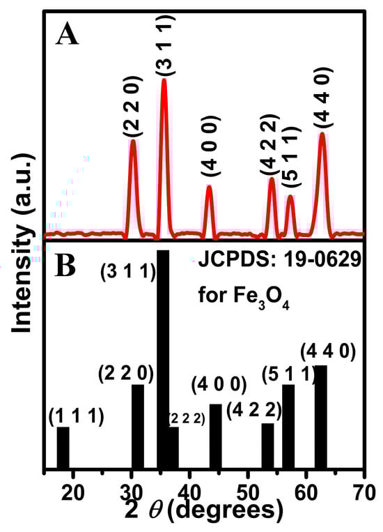 (A) XRD pattern of the synthesized Fe3O4 NPs; (B) corresponding JCPDS file: 19-0629.