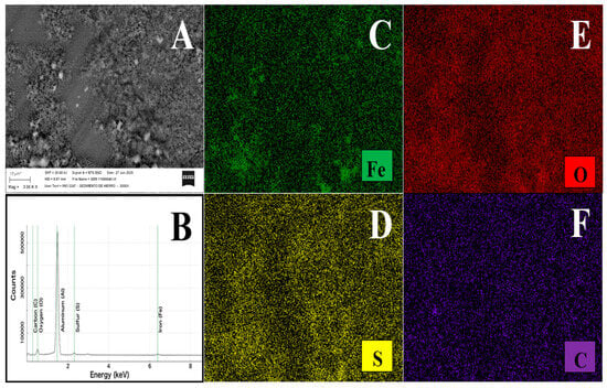 Additionally, the elemental composition of the Fe3O4 NPs was analyzed using energy-dispersive X-ray (EDX) analysis along with elemental mapping (Figure 3). The results show strong signals in the oxygen and iron regions, confirming the presence of Fe3O4 NPs. Figure S1 corroborated the presence of Fe and O, indicating the expected chemical composition of the Fe3O4NPs; a signal for aluminum was also detected, attributed to the sample holder. Moreover, signals corresponding to carbon (C), oxygen (O), and sulfur (S) were observed, which is likely due to the presence of polyphenols from the organic extracts capping the Fe3O4 NPs, thereby contributing to their stabilization [55].