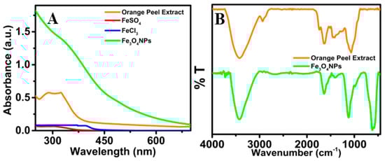 (A) UV–vis absorption spectra of Fe3O4 NPs synthesized with 0.5% of orange peel extract and Fe salts (B); FTIR spectra of Fe3O4 NPs synthesized using orange peel extract (green line) and orange peel extract (orange line).