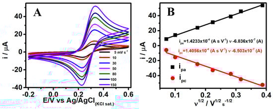 (A) CVs of Fe3O4NPs at different scan rates (0.005–0.150 V s−1) and (B) corresponding linear plot of the square root of scan rate vs. i. The [Fe(CN)6]3−/4− system was used for electrochemical characterization studies.