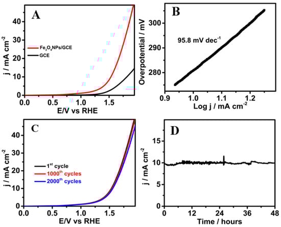 (A) LSV polarization curves recorded in 1.0 M KOH solution with GCE (black) and Fe3O4 NPs/GCE (red) electrodes at the scan rate of 2 mV s−1. (B) Tafel plot, (C) durability in 1.0 M KOH solution after 1000 and 2000 cycles, and (D) amperometric curves at an applied overpotential of 0.3 V for Fe3O4 NPs/GCE.