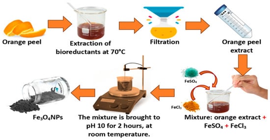 The green synthesis of Fe3O4 NPs was carried out by mixing FeSO4 and FeCl3 salts in a 2:1 ratio of 10 mM. Under constant stirring, the orange peel extract was added dropwise to the Fe salts solution, and the pH was adjusted to 10. The solution was stirred for 30 min at 300 rpm. Once this process was finished, the final solution was allowed to decant to remove the supernatant. The resulting Fe3O4 NPs were collected, washed with ethanol, and dried in an oven at 60 °C for 24 h, as shown in Scheme 1.