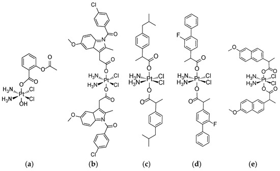 Selected cisplatin conjugates with various NSAIDs (employed as deprotonated carboxylic acids): (a) aspirin, (b) indomethacin, (c) ibuprofen, (d) flurbiprofen, and (e) naproxen. Complexes (c–e) are diastereomers.