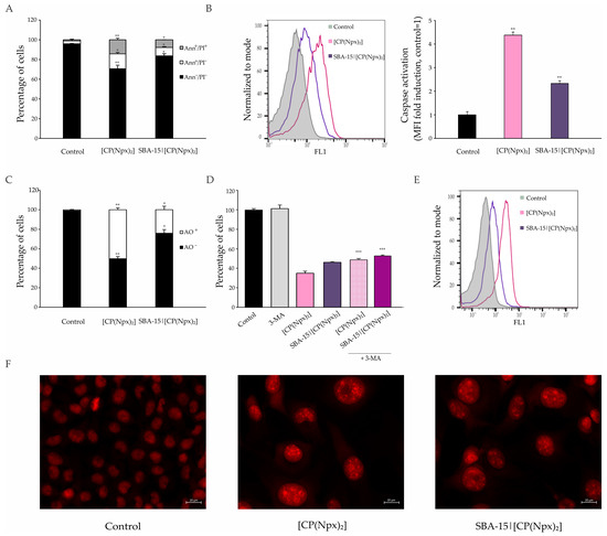 [CP(Npx)2] and SBA-15|[CP(Npx)2] induce caspase-dependent apoptosis together with autophagic cell death and loss of survived cell fraction dividing potential. The cells were treated with the IC50 of [CP(Npx)2] and the MC50 dose of SBA-15|[CP(Npx)2] for 72 h. Flow cytometric analysis of apoptosis by annexin V-FITC/propidium iodide (Ann/PI) double staining (A); total caspase activation after staining by Apostat (B); and autophagy after acridine orange staining (C) were completed. The effect of autophagy inhibition with 3-methyladenine (1 mM) on the viability of B16 cells (3-(4,5-Dimethythiazol-2-yl)-2,5-diphenyltetrazolium bromide, MTT assay) (D); flow cytometric analysis of cell proliferation by carboxyfluorescein diacetate succinimidyl ester (CFSE) staining (E); and fluorescence microscopy of PI-stained cells (F). Results are presented as mean values ± SD of three independent experiments while histograms are from one representative experiment. Statistical significance was determined and indicated as * p < 0.05, ** p < 0.01, and *** p < 0.001 compared to the untreated control.