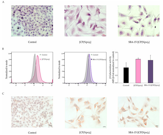 The inhibition of cell proliferation and the extremely enlarged nuclei of PI-stained cells observed upon treatment with free or SBA-15-loaded [CP(Npx)2] indicate changes in cellular phenotype, and thus, behavior. Conventional HE staining was performed to further characterize the cell shape and intracellular structures in more detail. Micrographs of HE-stained B16 cells showed that the applied treatments led to an appearance of the enlarged and flattened cells with enlightened cytoplasm (Figure 3B and Figure S9B), and together with introspections collected by PI staining about the nucleus oversize and the specific distribution of eu- and heterochromatin, it is suggested that survived cells may potentially be in a senescent state. Concordantly, a flow cytometric analysis of β-galactosidase activity, a main senescence biomarker, was next performed. Although in the case of SBA-15|[CP(Npx)2], β-galactosidase activity was less significantly increased than in cultures treated with the free hybrid molecule [CP(Npx)2], a significant increase in the expression of this enzyme was observed in both treatments compared to untreated cells (Figure 3B). As lipid droplets are abundant and enlarged in postmitotic and senescence-like cells, Oil red O staining was further performed in order to confirm the data obtained by flow cytometry. As evidenced in the light microscopy micrographs of cells exposed to treatment with free [CP(Npx)2] or, alternatively, SBA-15|[CP(Npx)2], numerous and significantly larger lipid droplets were found in the cytosol of treated cells compared to untreated cells (Figure 3C and Figure S9C). In summary, all features of survived cell fractions elaborated above underline the acquisition of a senescence-like phenotype in response to free and immobilized [CP(Npx)2].