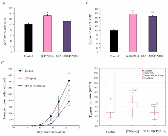 [CP(Npx)2] and SBA-15|[CP(Npx)2] induce differentiation of B16 cells into nonproliferative melanocytes. The cells were treated with the IC50 of [CP(Npx)2] and the MC50 dose of SBA-15|[CP(Npx)2] for 72 h, and melanin content (A), tyrosinase activity (B), and in vivo tumorigenicity tests (left—tumor growth curve, right—boxplot presentation of tumor volumes) (C) were completed (* p < 0.05 and *** p < 0.001 compared to the untreated control).