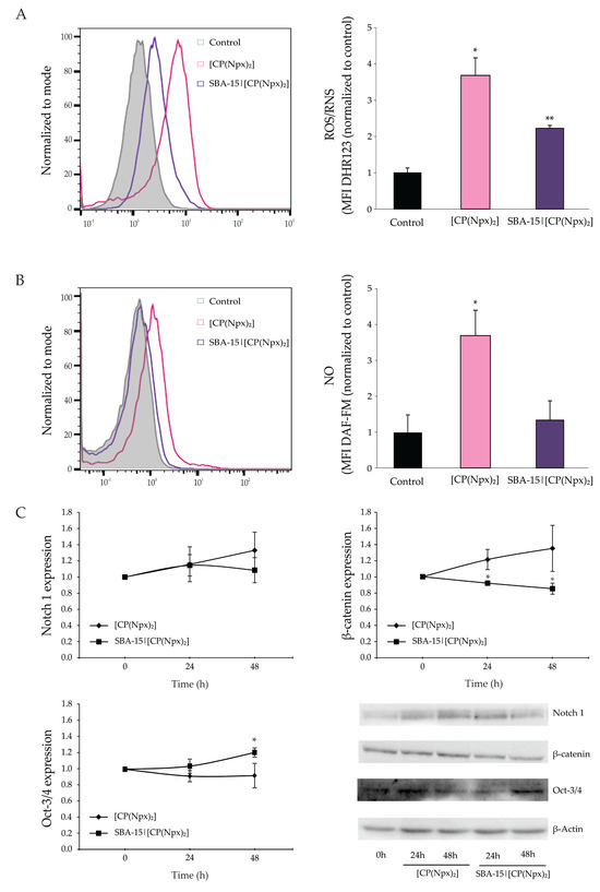 Effect of [CP(Npx)2] and SBA-15|[CP(Npx)2] on reactive oxygen/nitrogen species (ROS/RNS) production and expression of Notch 1, β-catenin, and Oct-3/4 proteins in B16 cells. The cells were treated with the IC50 of [CP(Npx)2] and the MC50 dose of SBA-15|[CP(Npx)2] for 72 h, and production of ROS/RNS by dihydrorhodamine 123 (DHR 123) (A) and intracellular NO by 4-Amino-5-methylamino-2′,7′-difluorofluorescein diacetate (DAF-FM) (B) were completed (left—representative of three independent experiments, right—mean values ± SD of three repeated experiments). The expression of Notch 1, β-catenin, and Oct-3/4 was evaluated during 48 h by Western blot analysis (C). Protein levels were expressed relative to β-actin. All data are presented as mean ± SD, * p < 0.05, and ** p < 0.01 compared to the untreated control.
