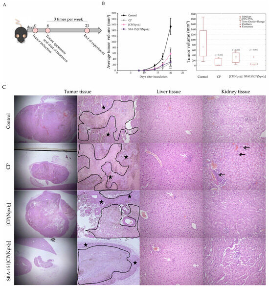 [CP(Npx)2] and SBA-15|[CP(Npx)2] efficiently reduced melanoma growth in vivo. The animals were treated with 10 mg/kg [CP(Npx)2], 30 mg/kg SBA-15|[CP(Npx)2], or 2 mg/kg CP. Schematic presentation of in vivo experiment (A); tumor growth curve and boxplot presentation of tumor volumes (* p < 0.05, ** p < 0.01, and *** p < 0.001) (B). Representative micrographs of the most significant histopathological alterations of tumor tissues (12.5× and 40× magnification), liver, and kidney tissues (200× magnification) (C). Tumor tissue necrosis is encircled with a black line, and viable tissue is marked with black stars. White arrows point to oligocellular necrosis, and black arrows denote foci of inflammation.