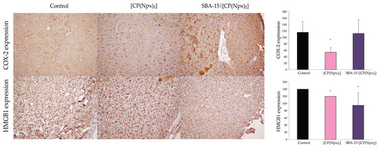 [CP(Npx)2] and SBA-15|[CP(Npx)2] suppressed inflammation inside tumor tissue. The animals were treated with a dose of 10 mg/kg [CP(Npx)2] and 30 mg/kg SBA-15|[CP(Npx)2]. COX-2 and HMGB1 expressions were evaluated by light microscopy (200× magnification). Representative micrographs of tumor sections for each group are presented, while the results are expressed as mean ± SD (n = 5) and * p < 0.05 compared to the untreated control.
