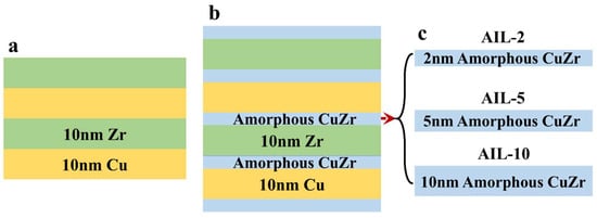 Schematic of (a) homogeneous and (b,c) designed nanolaminates with AIL structures. Three Cu/Zr nanolaminates with AIL were designed—AIL-2, AIL-5, and AIL-10—where the number represents the thickness of the amorphous interlayer.
