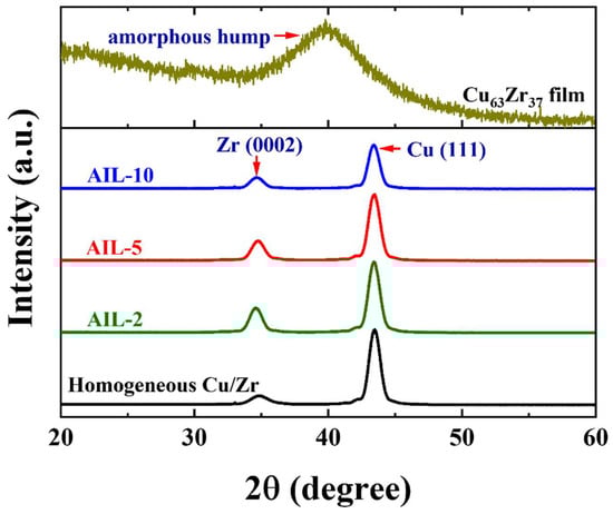 Figure 2 shows the XRD patterns of the as-deposited nanolaminates with AIL (AIL-2, AIL-5, and AIL-10), the homogeneous Cu/Zr nanolaminate, and the monolayer amorphous CuZr films. It can be observed that the monolayer CuZr film exhibits typical amorphous characteristics with a wide hump diffraction. The diffraction angle for the amorphous hump in the Cu63Zr37 film is approximately 40°, which is similar to CuZr, as reported by Sun et al. [47]. These three Cu/Zr nanolaminates with AIL all exhibit strong Zr (0002) and Cu (111) textures, and the intensities of the Zr (0002) and Cu (111) peaks in the three samples decreased with the increase of the AIL thickness. It can clearly be seen that the peaks of Zr (0002) and Cu (111) in the samples with AIL are approximately 34.5° and 43°, respectively, which is consistent with that of homogeneous Cu/Zr samples. This indicates that the introduction of CuZr AIL into the homogeneous Cu/Zr nanolaminates does not significantly alter the crystallographic orientation of the crystalline constituent layers.