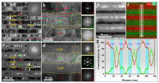 The cross-sectional microstructure of the as-deposited samples with AIL was characterized using TEM, as illustrated in Figure 3. The representative bright-field TEM images of AIL-2 (Figure 3a) and AIL-10 (Figure 3c) show the modulation layer structure with a clear interface, and both sides of all the crystalline Cu and Zr layers are covered by amorphous CuZr layers. The Cu and Zr layers of the samples exhibit a typical columnar polycrystalline structure along the film deposition direction. The corresponding SADP patterns inserted in Figure 3a,c show a sharp bright spot of Cu (111) and Zr (0002), as well as the amorphous halo ring, which is consistent with the XRD results (Figure 2). The actual thicknesses of the crystalline Cu, Zr, and amorphous CuZr layer in the AIL-2 and AIL-10 samples, measured by TEM, are summarized in Table 1. It can be seen that the actual layer thickness of each sample is consistent with the designed one. The high-resolution TEM (HRTEM) images of samples AIL-2 and AIL-10 are given in Figure 3b,d, and reveal the distinguishable interface of the C/A nanolaminates without intermixing. The fast Fourier transforms (FFT) patterns of the frame position in the insets of Figure 3b,d indicate FCC and HCP orientation in crystalline Cu and Zr layers, respectively, which is in contrast with the halo ring pattern detected in amorphous CuZr layers. High-angle annular dark-field scanning TEM (HAADF-STEM) also shows modulated layered structures of sample AIL-10, as shown in Figure 3e. The corresponding EDS mapping (Figure 3f) indicates a CuZr interlayer between the Cu and Zr layers, with the uniform distribution of Cu and Zr elements. Figure 3g shows the line scan result of Figure 3f along the white arrow direction, indicating that the sample has a chemically alternating layered structure composed of alternating stacked Cu layers, CuZr layers, and Zr layers.
