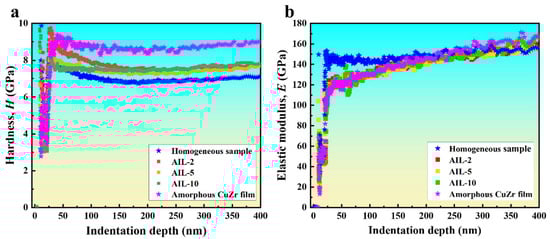 Representative (a) nano-hardness and (b) elastic modulus as functions of indentation depth for Cu/Zr nanolaminates with AIL (i.e., AIL-2, AIL-5, and AIL-10). The corresponding data for 10 nm homogeneous Cu/Zr and monolayer amorphous CuZr films are included for comparison.
