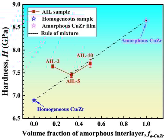 The nano-indentation results (Table 2) show that the hardness of the Cu/Zr nanolaminates with AIL decreases first and then increases with the reduction of the AIL. As illustrated in Figure 5, all samples with AIL exhibit significantly higher hardness compared to the 10 nm homogeneous Cu/Zr samples, demonstrating the enhancement in hardness by the AIL. Considering that the Cu/Zr sample with AIL was composed of the 10 nm homogeneous Cu/Zr sample and the monolayer amorphous CuZr film, the hardness can be calculated using the rule of mixtures, as follows [49,50]: