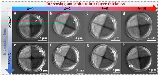 SEM images of the micro-indentation morphologies of the (a) homogeneous sample and AIL samples with h of (b) 2 nm, (c) 5 nm, and (d) 10 nm. (a–d) Indents with a load of 250 mN for 5 s, while (e–h) show the corresponding samples indented under a load of 500 mN for 5 s. The white arrows in (a–h) designate the SBs.