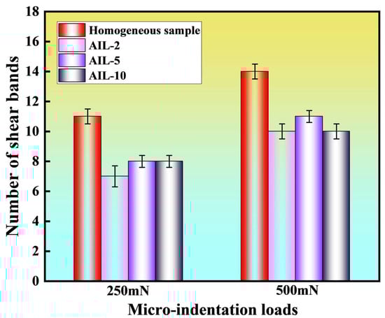 Therefore, more obvious circular-shaped pileups or SBs indicate severe shear deformation within the material, corresponding to a weaker resistance to shear instability. It is clearly observed that all samples with AIL exhibit fewer SBs compared to the homogeneous Cu/Zr samples under the same indentation loading, as marked by the white arrows in Figure 6. Furthermore, the number of SBs for each sample was derived from the average value of five independent tests, while the corresponding standard deviation of the five measurements was adopted to be the error bar, as plotted in Figure 7. Notably, sample AIL-2 exhibits the fewest SBs under both indentation loads. For instance, 11 circular-shaped SBs are formed in the homogeneous sample. In contrast, the samples with AIL (samples AIL-2, AIL-5, and AIL-10) show fewer SBs as compared to the homogeneous one, with respective values of 7, 8, and 8 under a load of 250 mN.