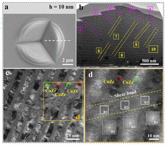 To investigate the deformation inside the indentation, the cross-sectional microstructure of the nanolaminates with AIL (AIL-2 and AIL-10) after nano-indentation tests was characterized by TEM. The SEM image (Figure 8a) reveals multiple circular pileups in the residual nano-indentations, which is consistent with the morphology of the corresponding micro-indentation. It can be observed that ten SBs, here denoted as 1 to 10, marked by the yellow and purple dotted lines, are generated beneath the indentations of the AIL-10 samples (Figure 8b). These SBs continuously cross through the constituent layer and are distributed along the extrusion direction (1 to 5) and the indentation direction (6 to 10), respectively. It is found that the initiation and end positions of the SBs distributed along the indentation direction (6 to 10) are both within the sample. This may be attributed to the geometric constraints imposed by the Si substrate and the indenter during the formation of the SBs. In contrast, extrusion-aligned SBs (1 to 5), unconstrained by the indenter geometry, propagate freely to the sample surface. The magnified TEM image of the locally indented region, as shown in Figure 8c, shows that the modulation layer structure of the composites has been severely broken, with obvious discontinuities appearing between adjacent layers and interfaces. Moreover, the crystalline Cu and Zr layers, along with the amorphous CuZr interlayer, interpenetrate each other in the localized regions, as revealed by the HRTEM image in Figure 8d. Moreover, severe elemental mixing occurred between adjacent layers, which led to amorphization within the SB, as illustrated by the FFT image inset in Figure 8d. This indicates that severe localized deformation occurs within the composites under the shear stress. According to its characteristics, this deformation is referred to as a cutting-like shear banding.