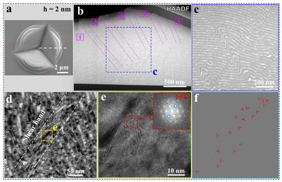 Metallic nanolaminates have attracted extensive scientific interest in materials science because of their exceptional mechanical properties [1,2,3], such as ultra-high strength [4,5,6,7], excellent thermal stability [8,9,10,11], and good radiation damage tolerance [12,13,14,15]. However, nanolaminates generally exhibit poor strain hardening due to the extremely confined dislocation activity in the nanoscale interface space, making them prone to premature strain localization-induced failure. For example, uniaxial tensile tests on Cu/Zr, Cu/Nb, and Cu/Ru nanolaminates revealed an extremely low elongation (less than 4%) [16,17,18]. Shear banding is a typical strain localization-induced plastic instability that is prevalent in the plastic deformation of nanolaminates, nanocrystalline metals, and amorphous alloys [19,20,21,22,23]. For example, micro- and nano-indentation tests on the Cu/Au, Cu/Cr, Cu/Nb, Cu/Ta, and Cu/Zr nanolaminates demonstrate that profuse circular shear bands (SBs) consistently emerge at the indentation surface when the individual layer thickness of nanolaminates is reduced to several tens of nanometers [19,20,23,24,25,26,27]. The formation of circular SBs in these nanolaminates was attributed to the grain boundary-mediated movement (accompanied by grain rotation) due to limited dislocation activity. Further, when subject to micropillar compression (approximate uniaxial stress state), nanolaminates also exhibit several typical plastic instabilities, such as shear banding mediated by interface rotation and sliding [28,29] and interface failure induced by the incompatible deformation between soft and hard layers [30,31].