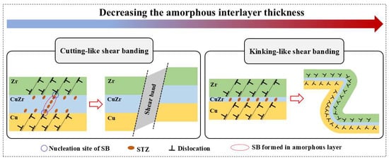 It is worth noting that two types of SBs, i.e., cutting-like shear banding (as shown in Figure 8) and kinking-like shear banding (as shown in Figure 9), were discovered in the designed nanolaminate with AIL. This suggests that the thickness of the introduced AIL significantly modulates the shear deformation response of the Cu/Zr nanolaminates. Experiments by Cui et al. [22] also demonstrated that varying the amorphous layer thickness significantly affects the shear banding behavior of the Cu/amorphous CuZr nanolaminate. This is primarily because the plastic deformation of the amorphous phase was accommodated by the formation of SBs or STZ [51,52,53]. According to the Griffith criterion, the stress required for SB formation is described as follows [54,55]: