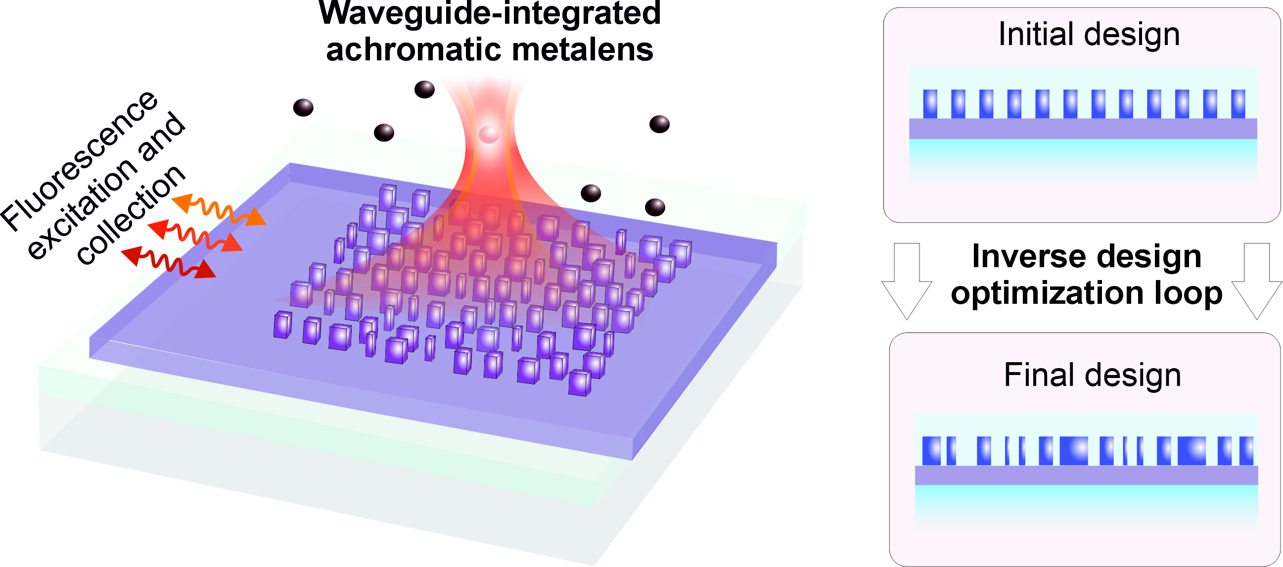 Achromatic free-space metalenses correct for the inherent chromatic dispersion of diffractive structures, which causes light to focus at different locations for distinct wavelengths, operating from the visible to THz regime [8,38,39,40]. However, correcting chromatic aberrations becomes more challenging in on-chip integrated metalenses, due to the wavelength-dependent propagation constant of the guided mode. Traditional design approaches rely on the detour phase [27,41], where identical meta-atoms are placed at specific locations along the waveguide. While simple, these approaches severely limit design flexibility by constraining the available degrees of freedom. More advanced methods leverage variable-size meta-atoms selected from a precomputed library [42,43]. However, for waveguide-integrated metalenses, meta-atoms are typically placed non-periodically along the propagation axis to get additional phase control. This disrupts the local periodicity assumption on which library-based methods rely, leading to inaccurate phase predictions. Moreover, conventional phase-engineering approaches are typically constrained to operate in a regime of weak coupling between the meta-atoms and the waveguide to avoid significant perturbation of the guided mode. This imposes additional limitations on the design space, particularly on the maximum size of the meta-atoms. However, larger meta-atoms can be advantageous in the context of achromatic metalenses, as they offer increased group delay, which is essential for compensating chromatic dispersion. Although a numerical design of a segmented integrated metalens operating at specific wavelength pairs has been shown in the visible [44], such designs suffer from reduced focusing efficiency and limited performance across multiple wavelengths, ultimately diminishing light collection efficiency and, therefore, hindering potential applications in multispectral imaging or single-molecule fluorescence sensing.