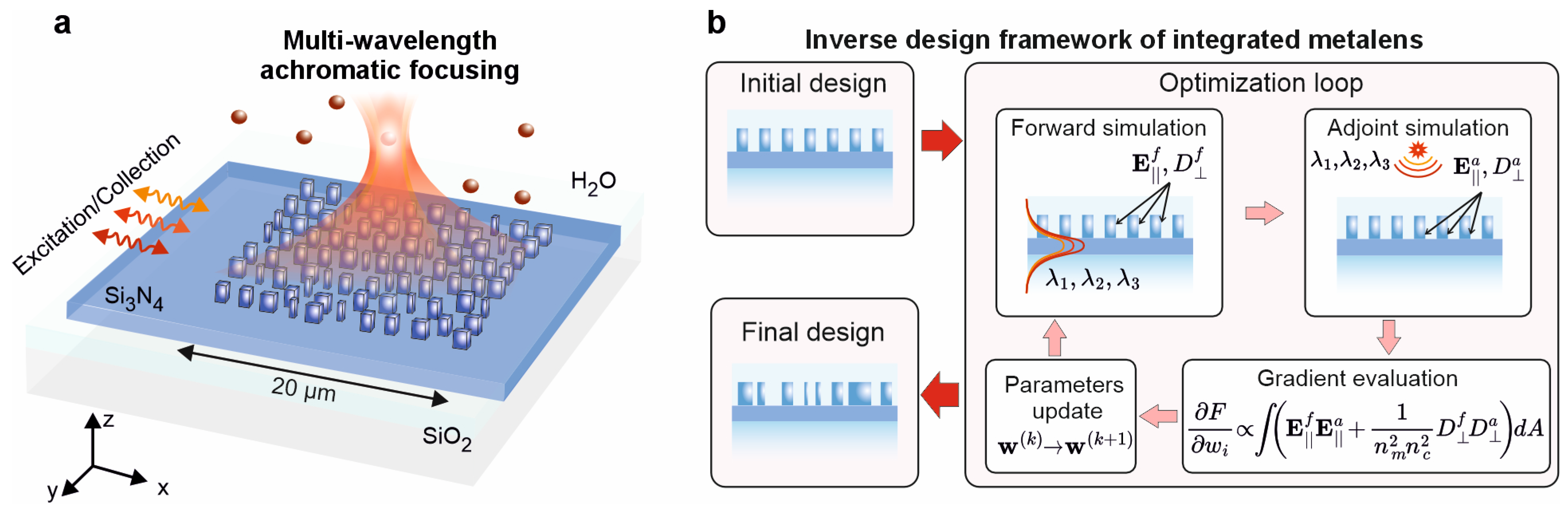 Figure 1. Inverse design of a multi-wavelength achromatic metalens. (a) Concept of an achromatic on-chip metalens for single-molecule fluorescence sensing. (b) Overview of the inverse design framework, which optimizes the widths and positions of rectangular dielectric meta-atoms to achieve achromatic focusing.