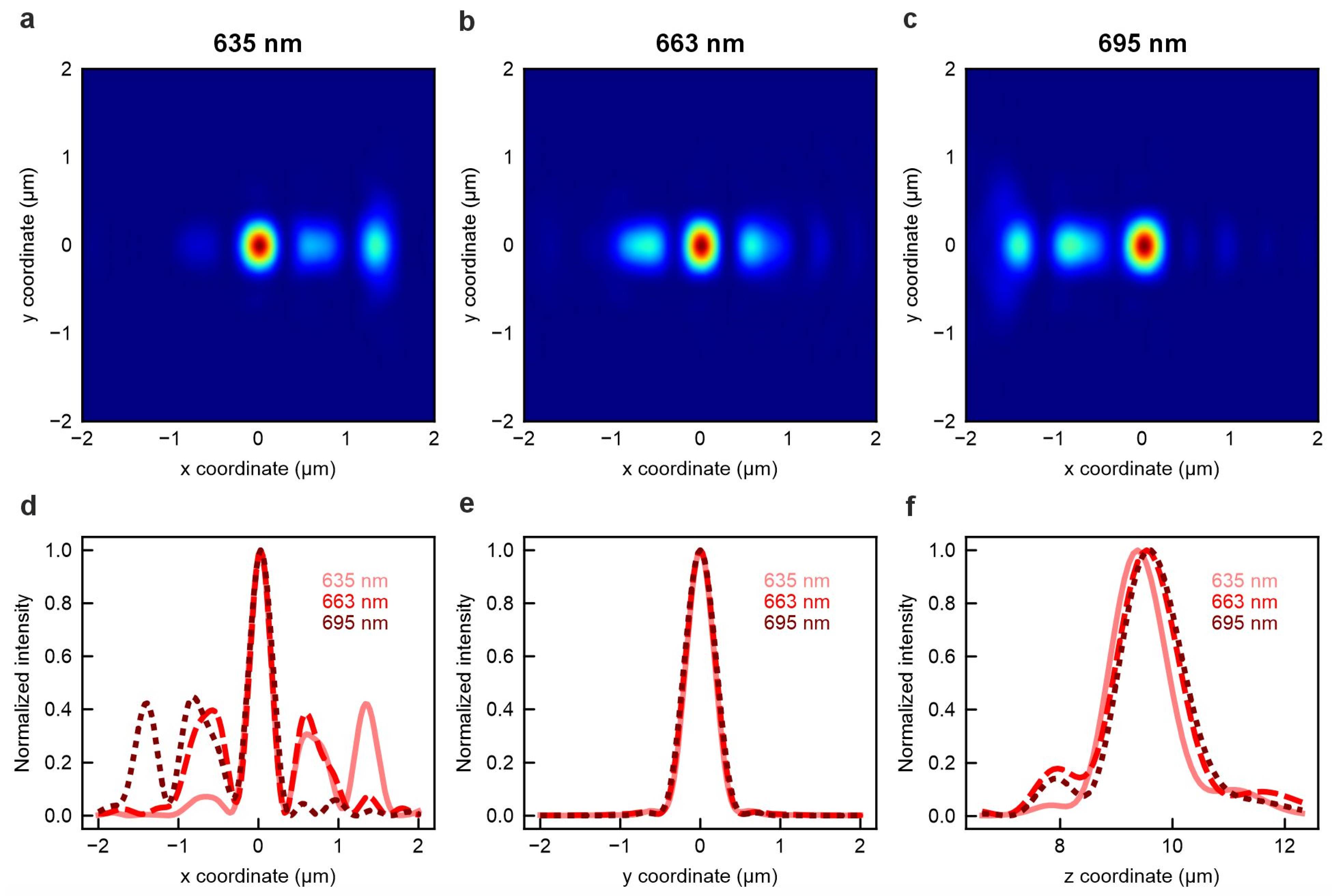 Figure 2. Optical performance of the inverse-designed achromatic on-chip metalens. Lateral point spread functions (PSFs) at wavelengths of (a) 635 nm, (b) 663 nm, and (c) 695 nm. Corresponding one-dimensional PSF intensity profiles along the (d) X, (e) Y, and (f) Z direction.
