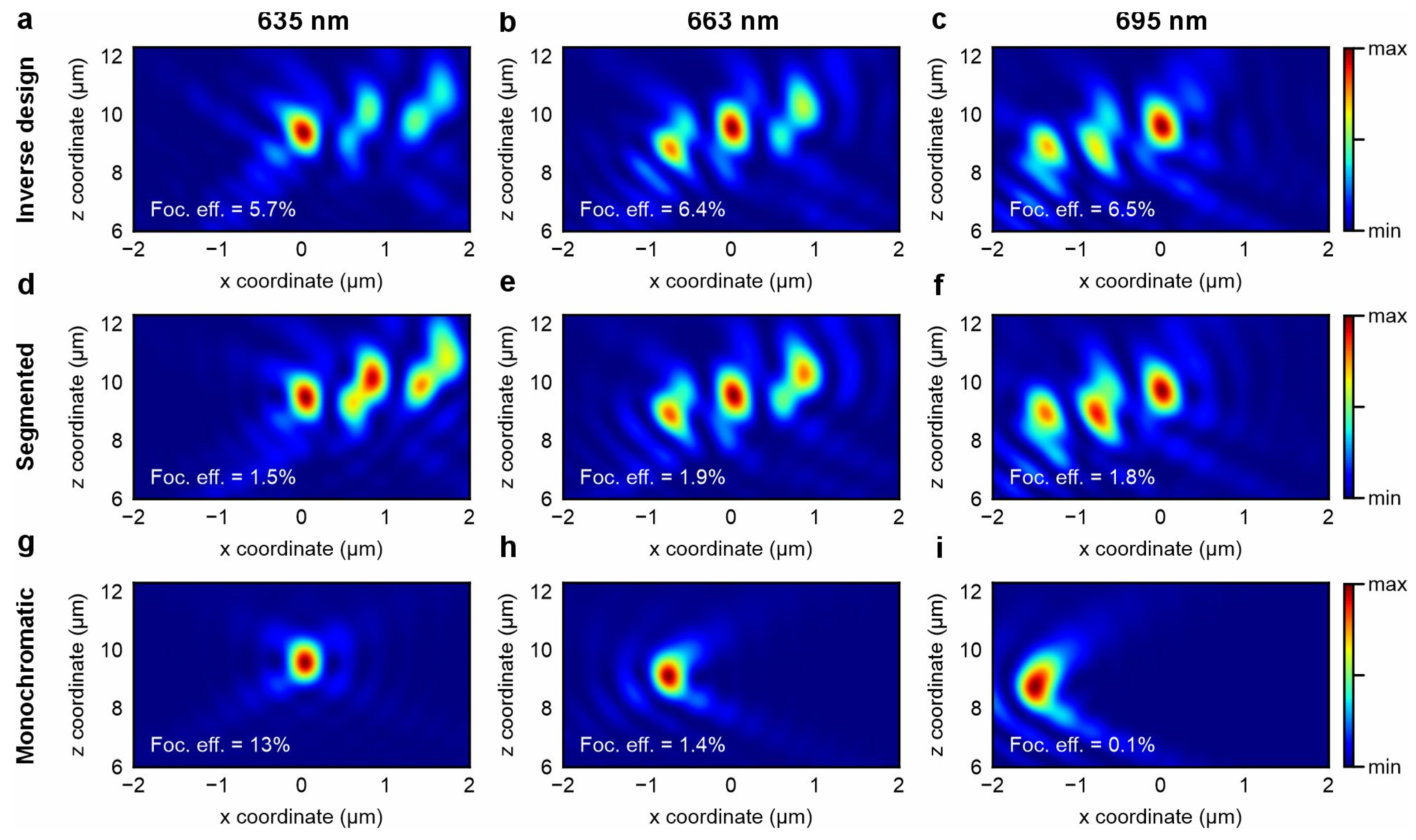 Figure 3. Comparison of point spread functions for three metalens designs at target wavelengths of 635 nm, 663 nm, and 695 nm. Axial point spread functions of (ac) inverse-designed achromatic metalens, (df) segmented design, and (gi) monochromatic design optimized for 635 nm.