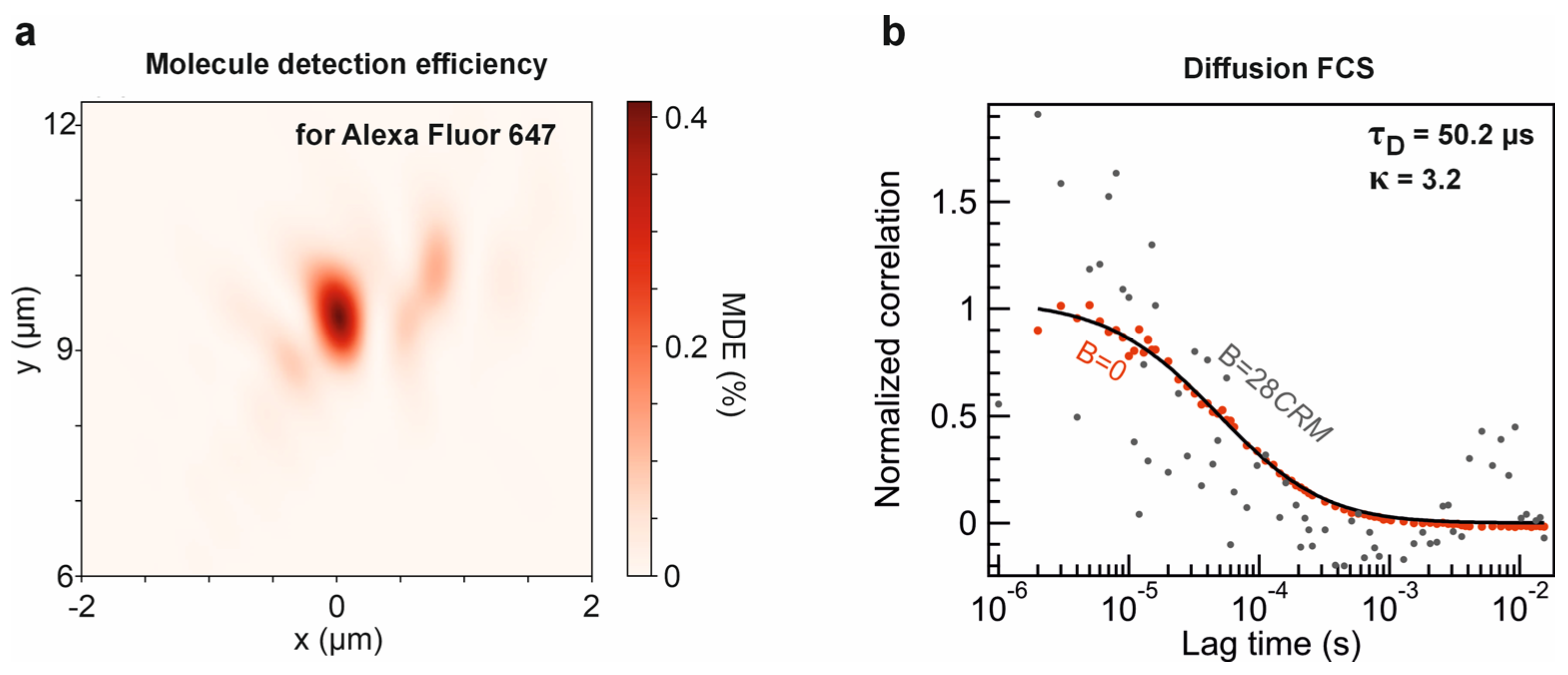 The total number of photons collected from a single molecule can be determined as [56]: C R M = M D E · ψ · S 1 ¯ · τ 1 , where ψ is the quantum yield of the fluorophore, S 1 ¯ is the steady state population of the first excited state, and τ is the lifetime of the fluorophore. We simulate the FCS data (autocorrelation functions) of diffusing Alexa Fluor 647 molecules in the aqueous solution (diffusion coefficient 330 μm2/s). The simulations are conducted via a Monte Carlo approach (SimFCS3 https://www.lfd.uci.edu/globals/, accessed on 14 July 2025). Similarly to isotropic 3D Brownian motion, molecules were allowed to stochastically move through a 3D voxel grid with 50 nm spacing within a simulation volume of 262 μm3. Photon emission events were sampled according to the MDE distribution, and simulated photon timestamps over 30 s were used to generate the fluorescence autocorrelation curve (Figure 4b). It is worth noting that the autocorrelation function exhibits a signal-to-noise ratio above 3 at near-zero lag times, acceptable for FCS running [57], even with background noise intensity of 28·CRM. The autocorrelation data exhibit characteristic decay due to diffusion and are well-fitted by the standard 3D Brownian diffusion model: