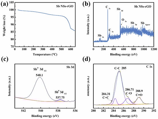 (a) TGA curve of the Sb NSs-rGO hybrid under N2 atmosphere. (b) XPS survey of Sb NSs-rGO hybrid. (c) Sb 3d sub-spectra, (d) C 1s sub-spectra.